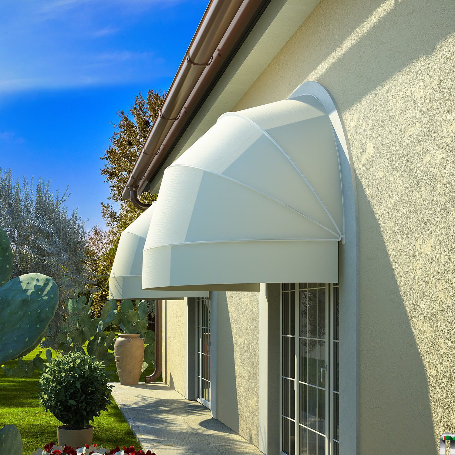La forma bombata, graziosa e retrò, fa della capottina un tipo di tenda per esterni particolarmente ornamentale.