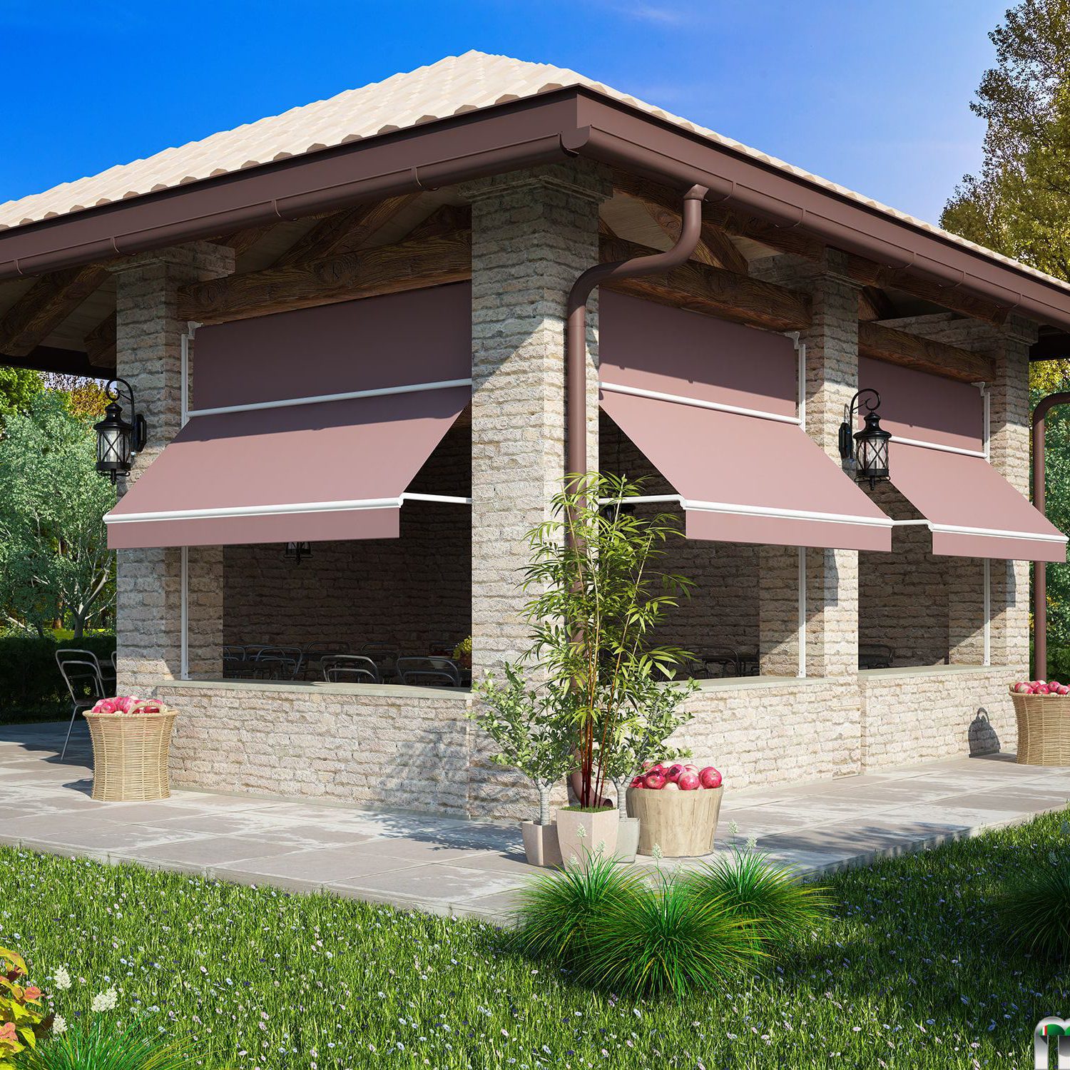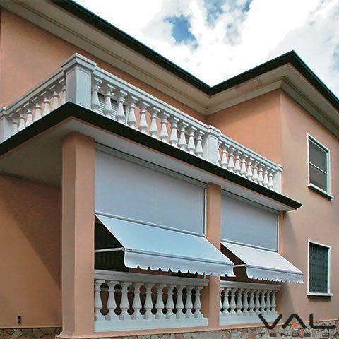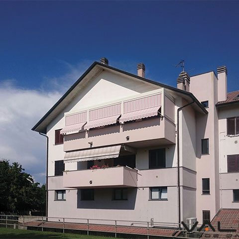 In presenza di guide laterali invece i braccetti scorrono nella guida collegati da un frangi tratta che permette alla tenda di interrompersi nella discesa verticale aprendo verso l’esterno.