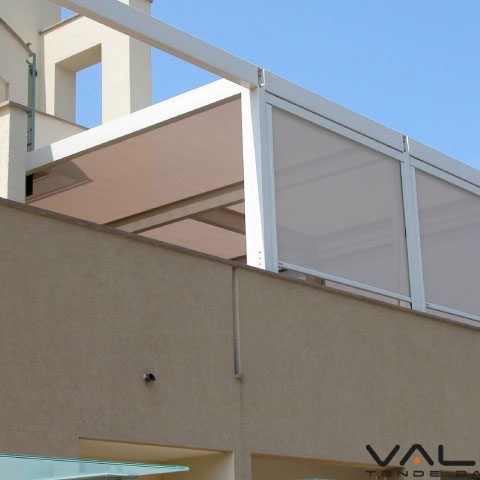 In questa tipologia di tenda le guide in alluminio vengono sostituite da degli eleganti cavi in acciaio.